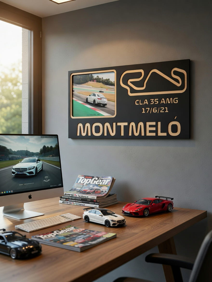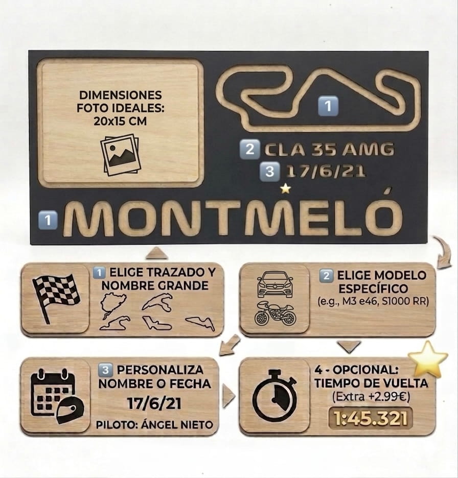 ¿Has rodado en pista y quieres guardar ese momento para siempre? Nuestra Placa de Recuerdo es el trofeo definitivo para tu garaje o habitación. Fabricada artesanalmente en madera con acabado premium, esta pieza exclusiva captura la esencia de tu día de tandas o competición.